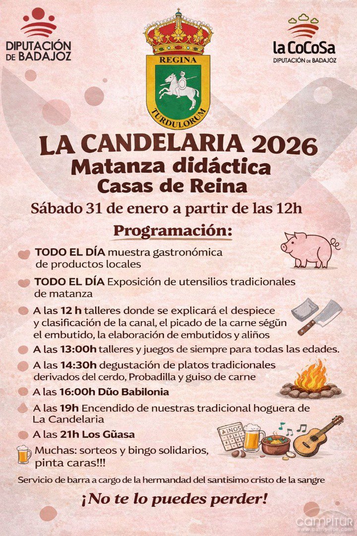 Casas de Reina volverá a celebrar por todo lo alto La Candelaria 2026 con una propuesta que pone en valor las costumbres populares y la gastronomía de siempre: una Matanza Didáctica pensada para disfrutar y aprender en un ambiente festivo, con actividades para todos los públicos durante toda la jornada.