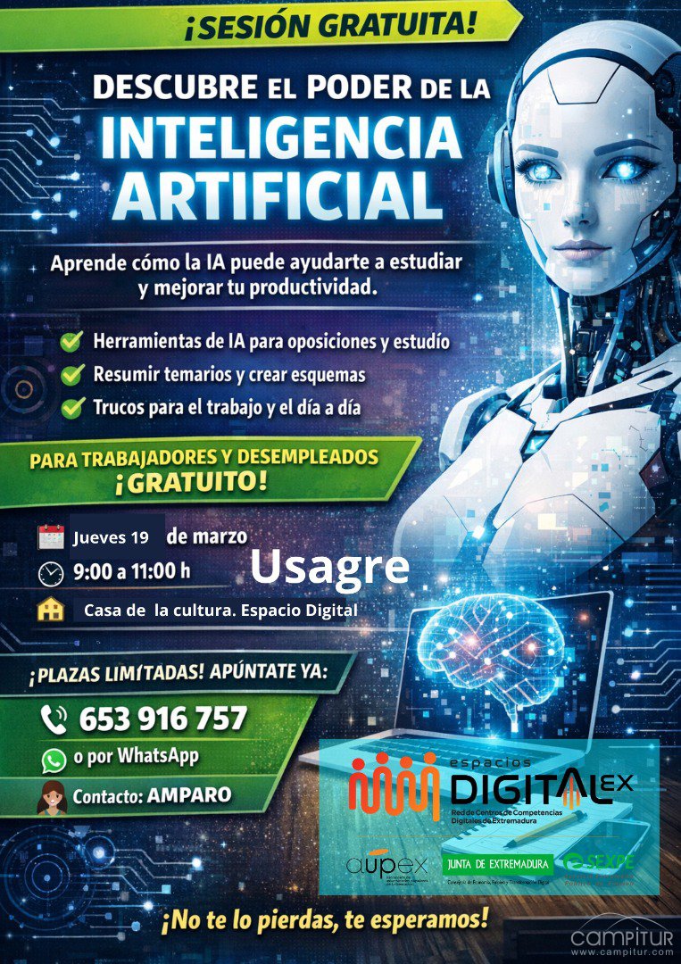 La localidad de Usagre acogerá el próximo jueves 19 de marzo una sesión formativa gratuita centrada en el uso práctico de la Inteligencia Artificial en la vida diaria. La propuesta, con una duración de dos horas, está pensada para acercar esta tecnología a trabajadores y personas desempleadas que quieran conocer de qué manera puede ayudarles a estudiar, organizar tareas o mejorar su productividad.